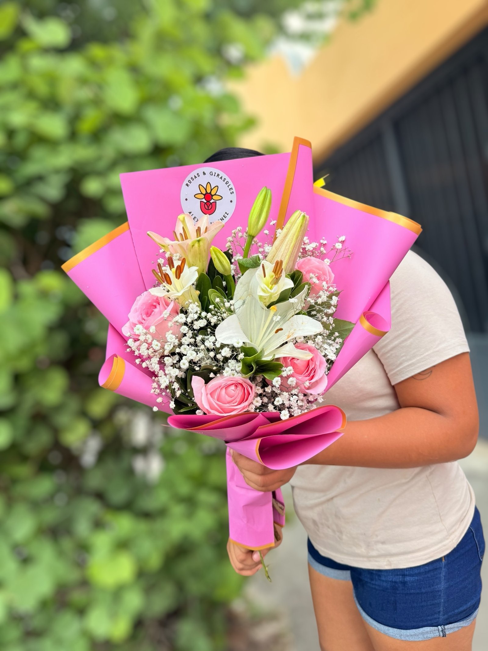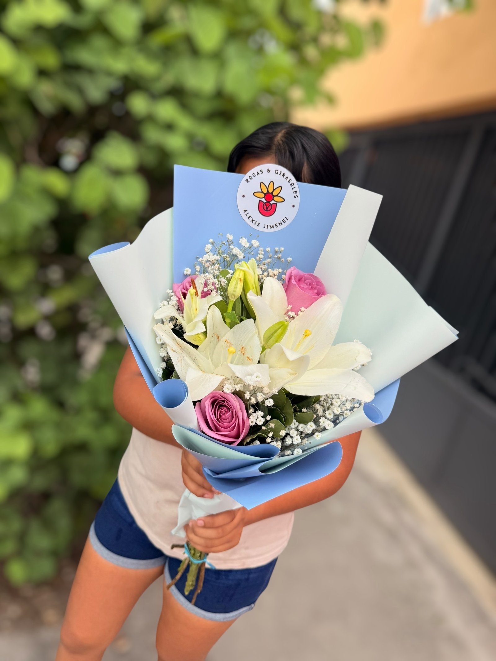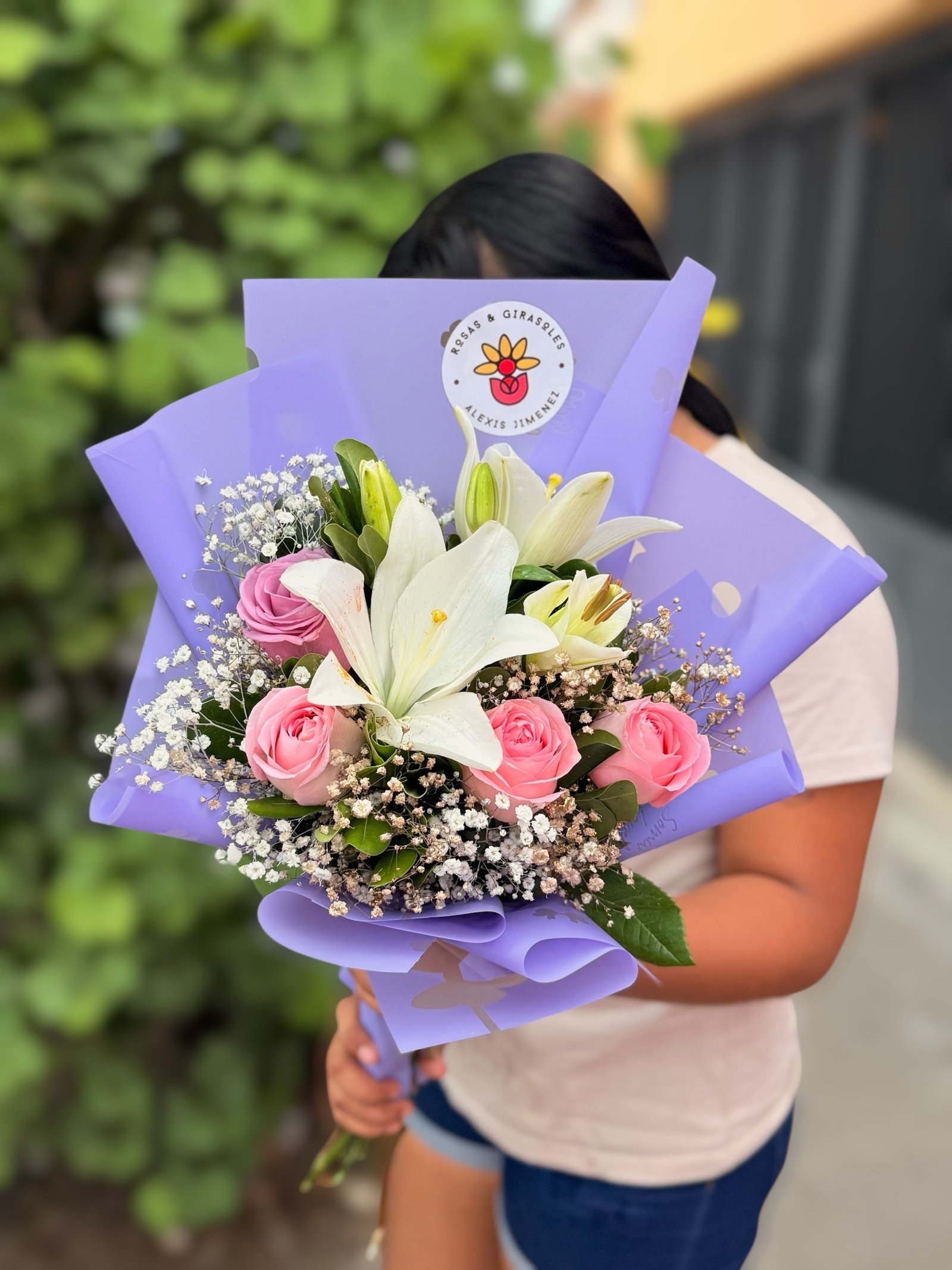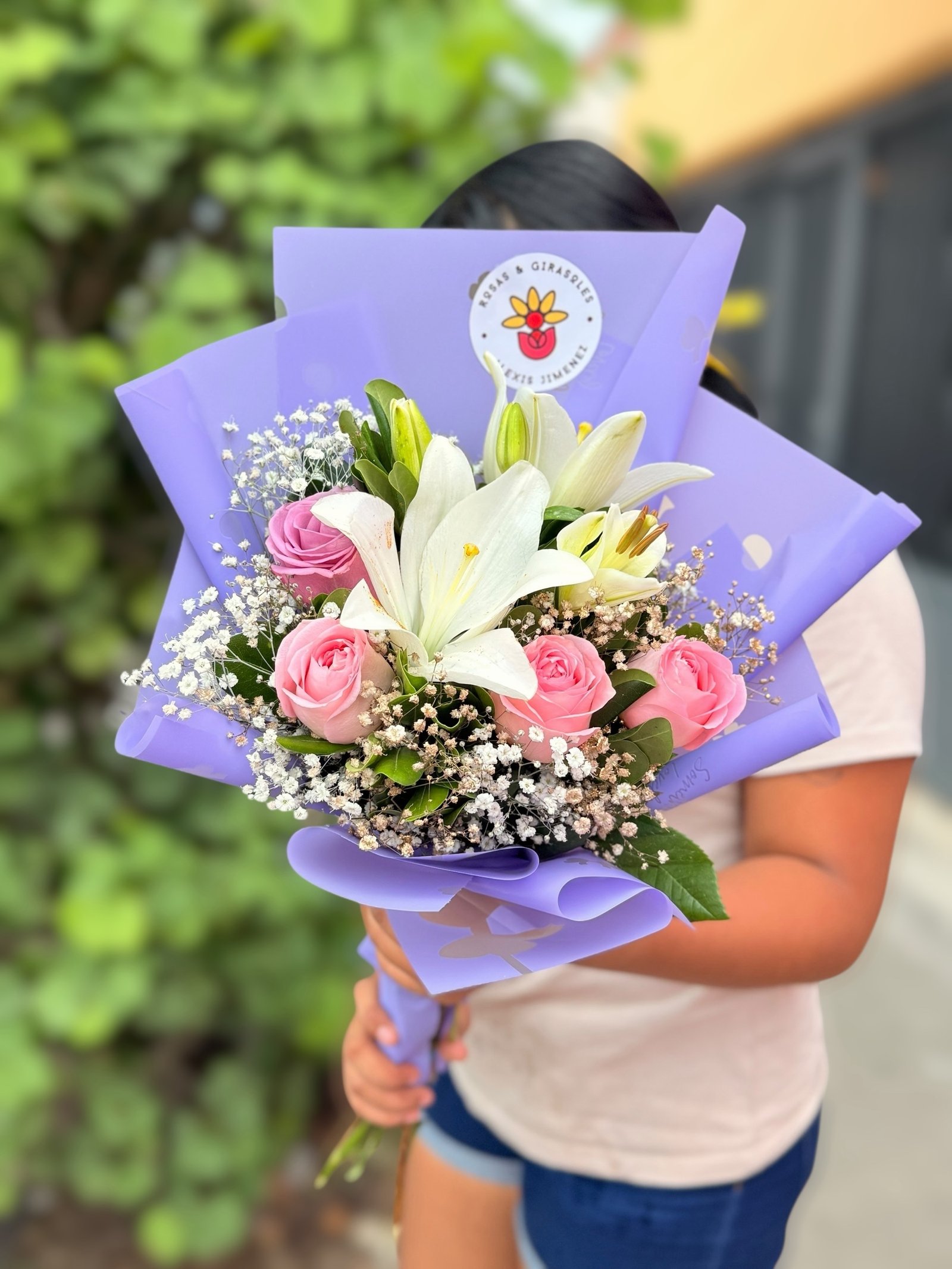 Romántico y suave, este ramo combina la pureza de los lirios blancos con la ternura de las rosas rosadas y el encanto de la gypsophilia, todo envuelto en un papel lila que resalta su delicadeza.