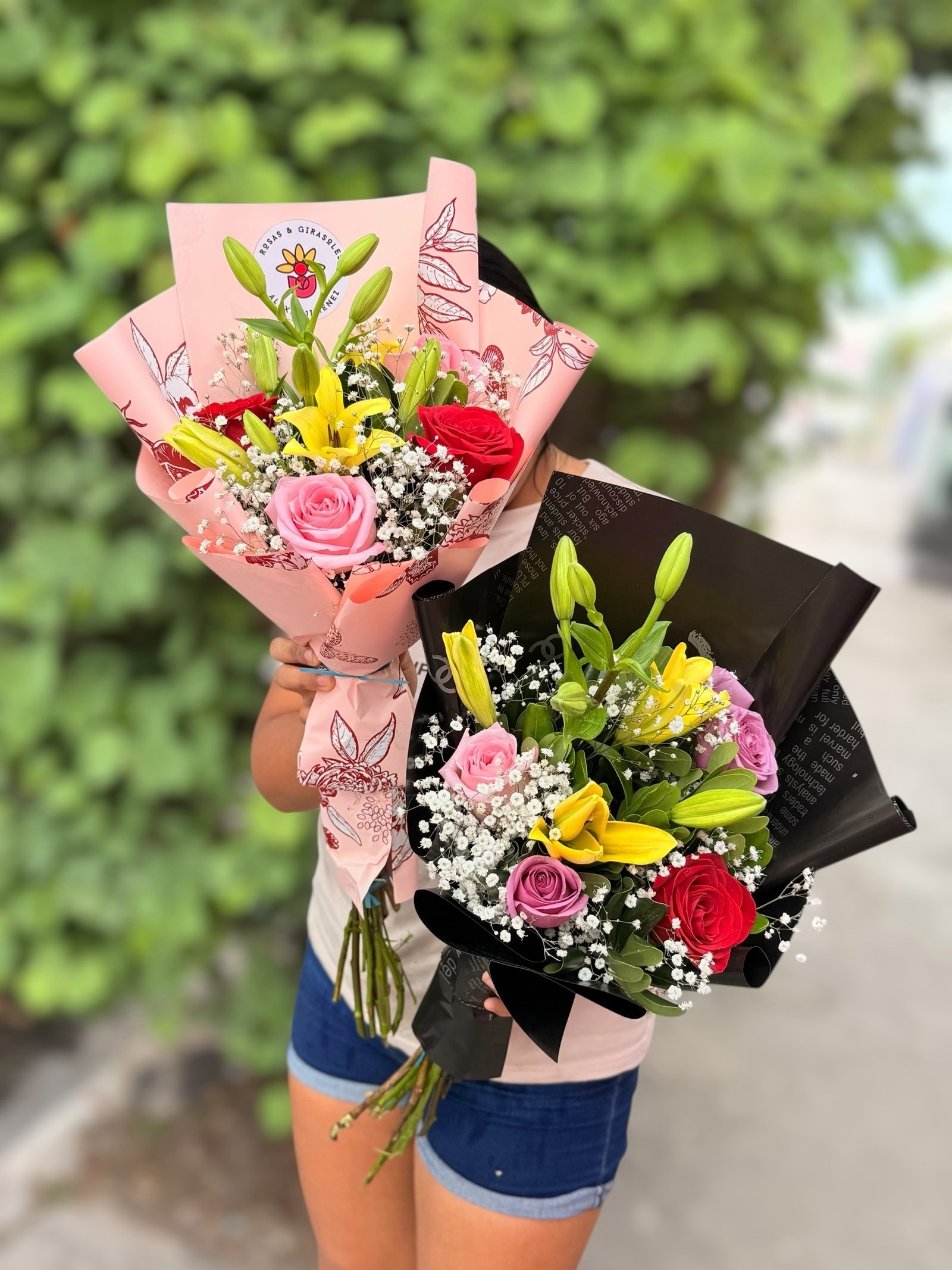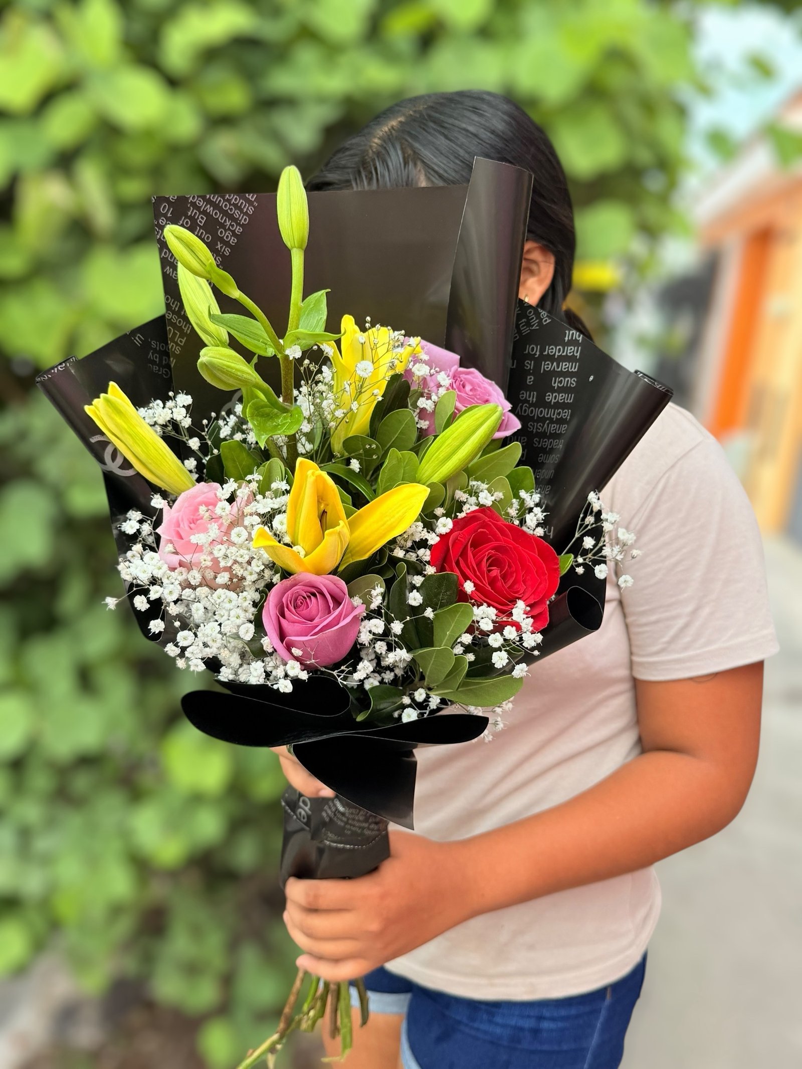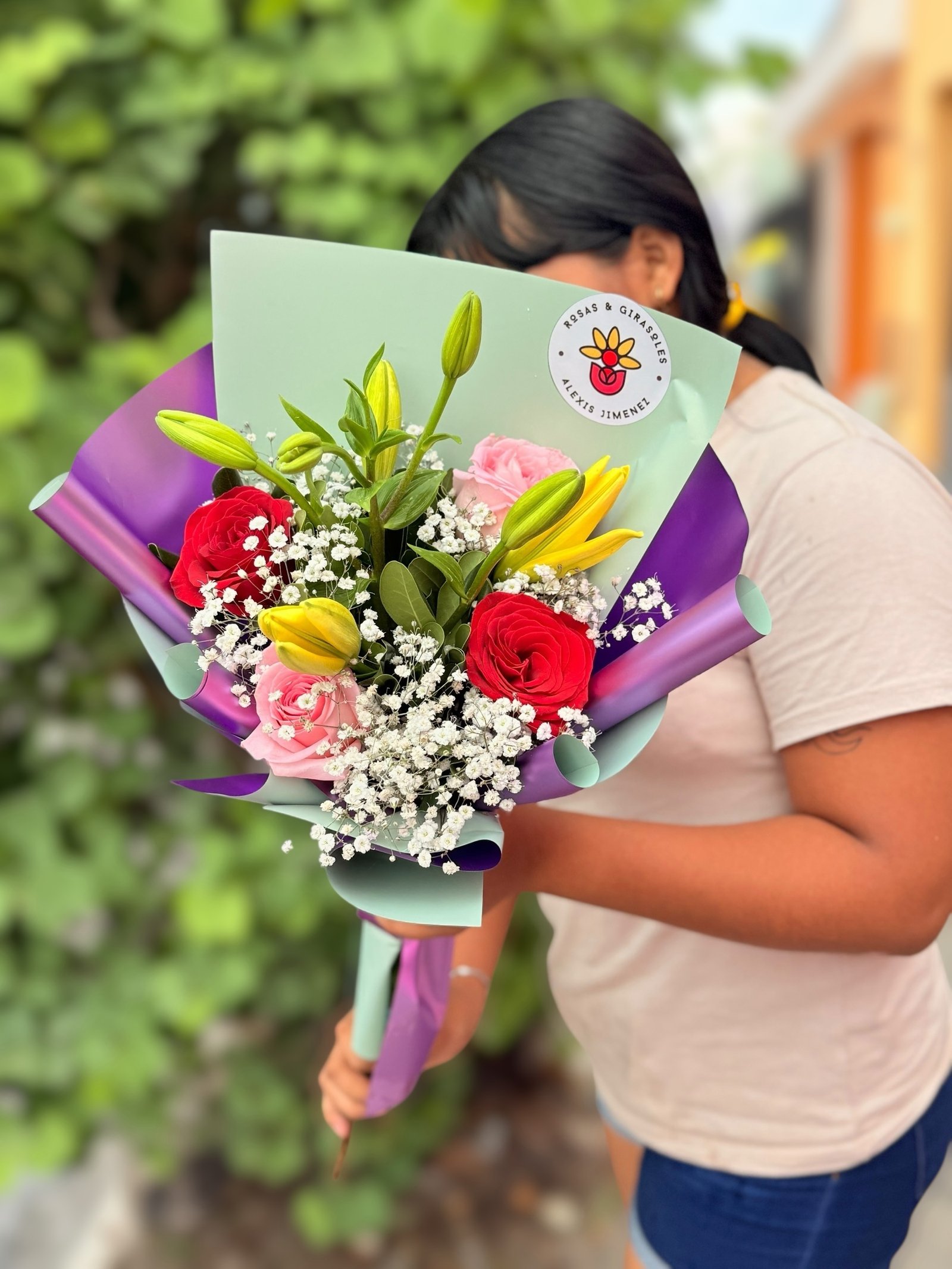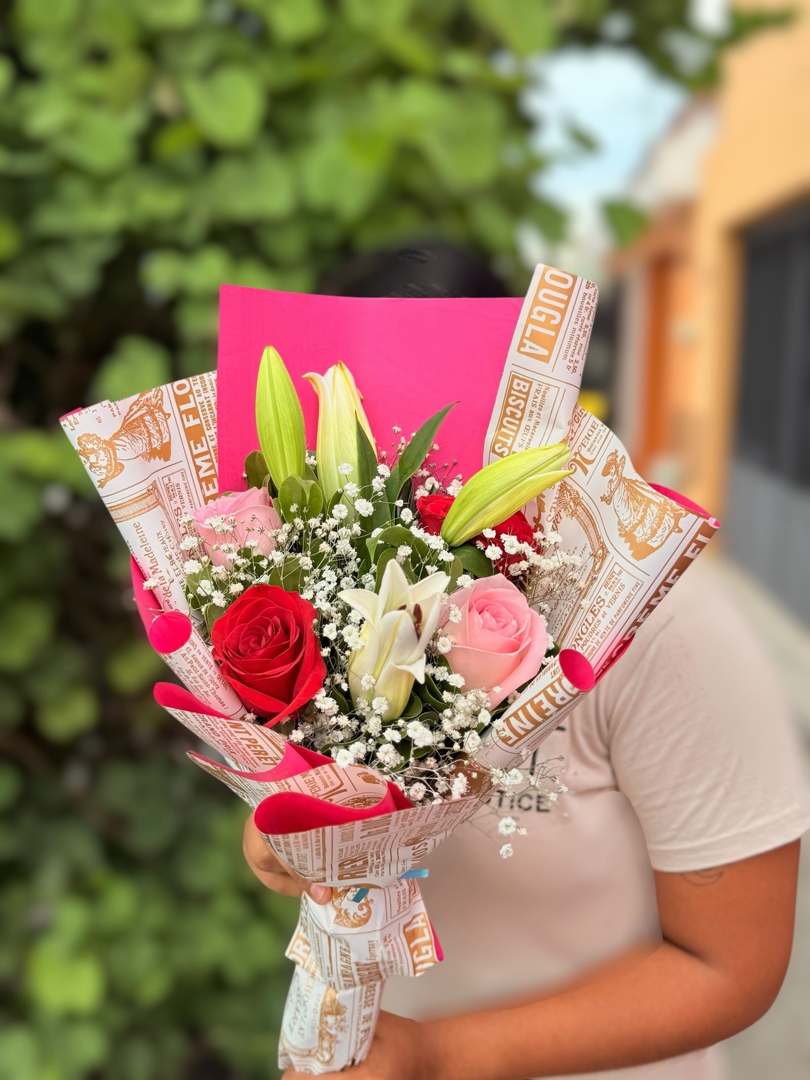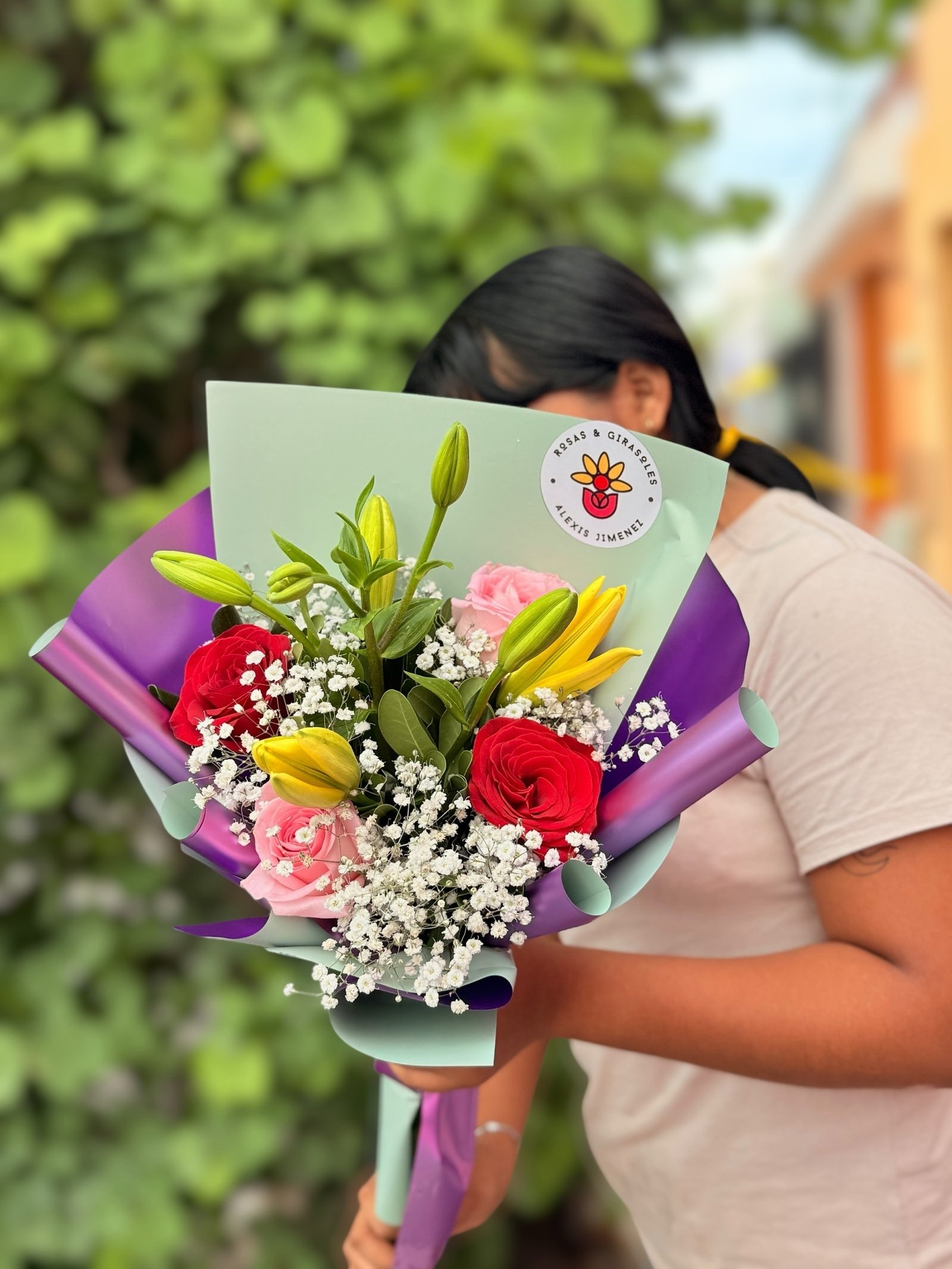 Romántico y suave, este ramo combina la pureza de los lirios blancos con la ternura de las rosas rosadas y el encanto de la gypsophilia, todo envuelto en un papel lila que resalta su delicadeza.
