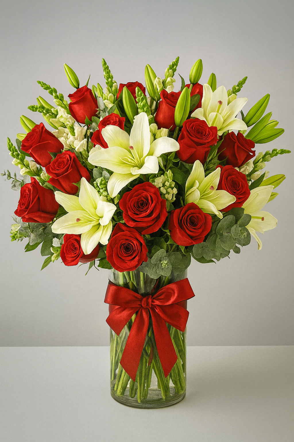 Un arreglo imponente y romántico en jarrón de vidrio cilíndrico, adornado con un listón satinado rojo que realza su elegancia.