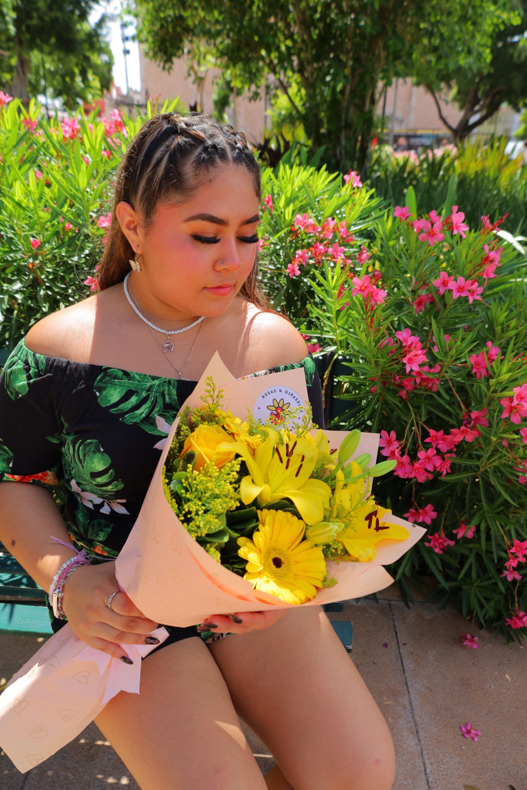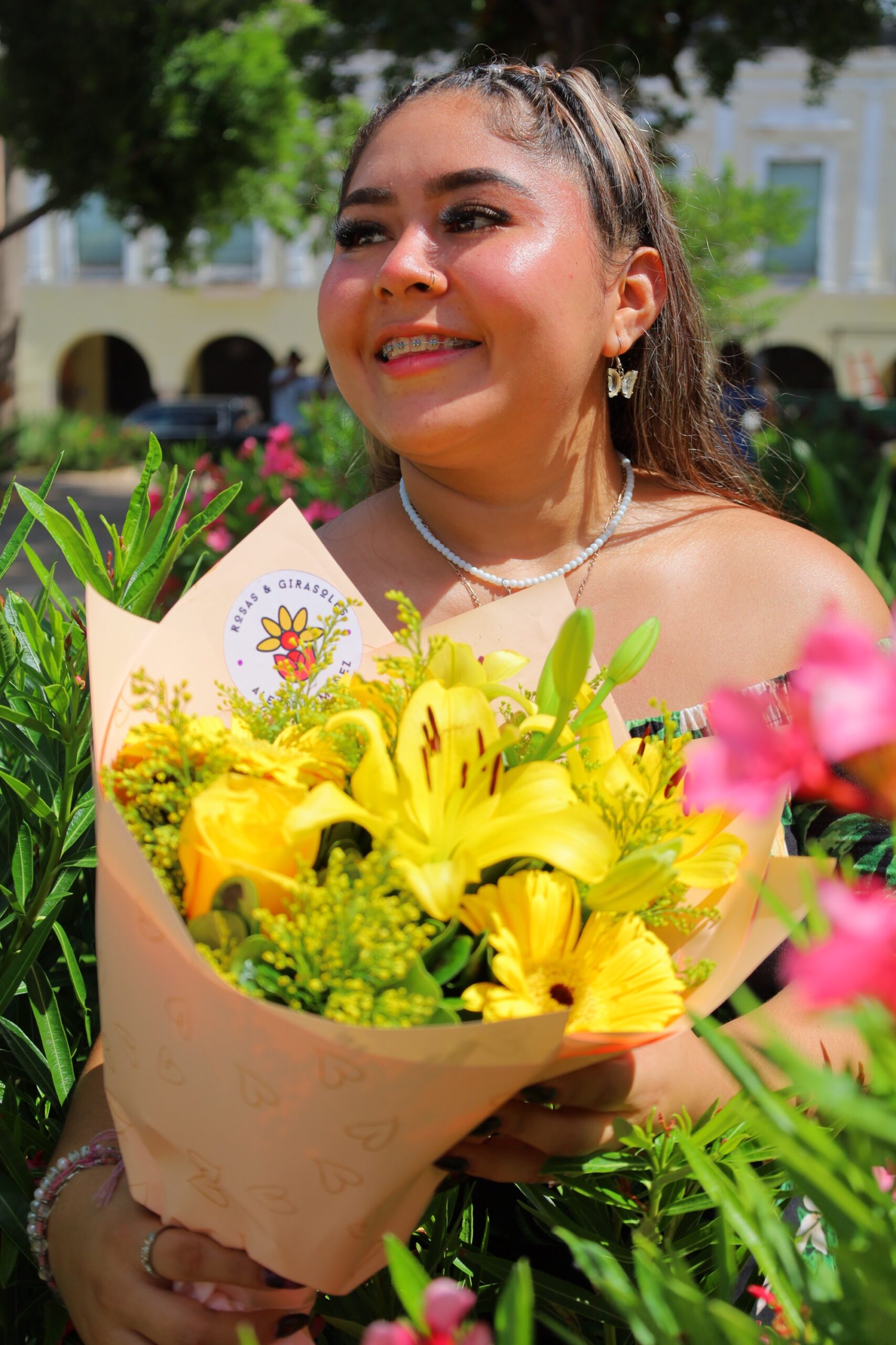 Un hermoso ramo de flores amarillas envuelto en papel coreano color durazno con listón satinado rosa.