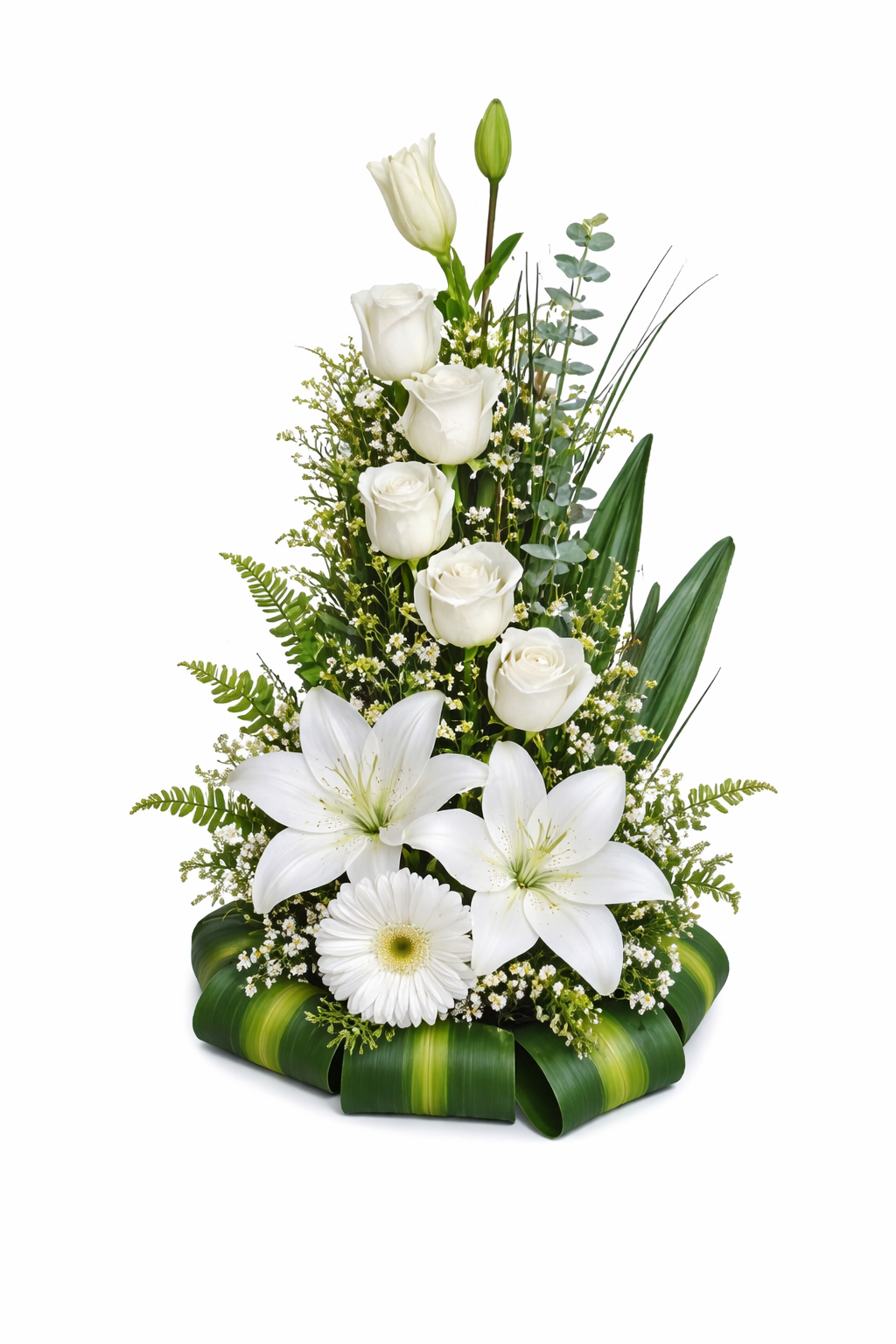 Elaborado con rosas blancas de tallo largo, lilis frescas, gerbera blanca y delicados follajes verdes que realzan su diseño moderno y sofisticado.